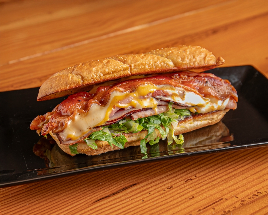 The Deas Special, loaded with hot thin sliced black forest ham, bacon, American & Swiss cheese served on a fresh toasted french roll with spicy mayo and lettuce. This is a fan favorite for sure